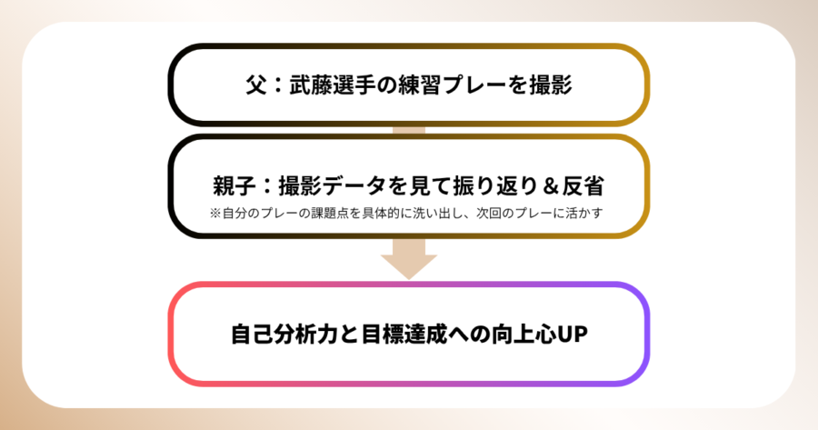 地道で分析的な取り組みは、父との共同作業を通じて、武藤選手に自己分析能力と目標達成への向上心UPを習慣づけました。