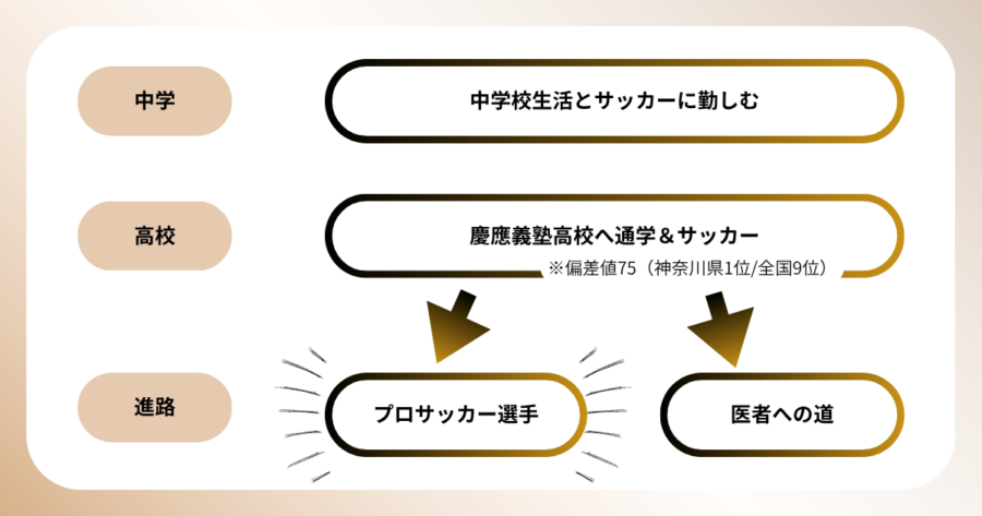 武藤選手は、もしプロサッカー選手になれない場合は「医者になる」という明確な目標を持ち、慶應義塾高校や早稲田実業高校への進学を選択肢としていました。