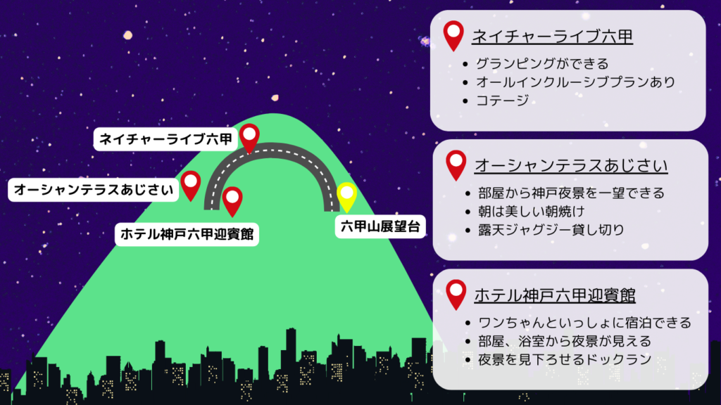 神戸市内のホテル最上階で神戸夜景を楽しめる、というよりは、山の上から神戸夜景を見下ろせるという宿泊施設のみに絞ってご紹介します💡