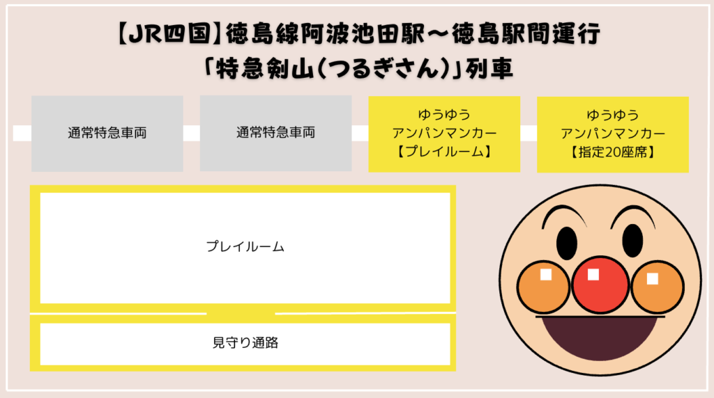 調べてみると、プレイルームがあるアンパンマン列車はゆうゆうアンパンマンカーと言って、運行は徳島←→阿波池田区間のみです。