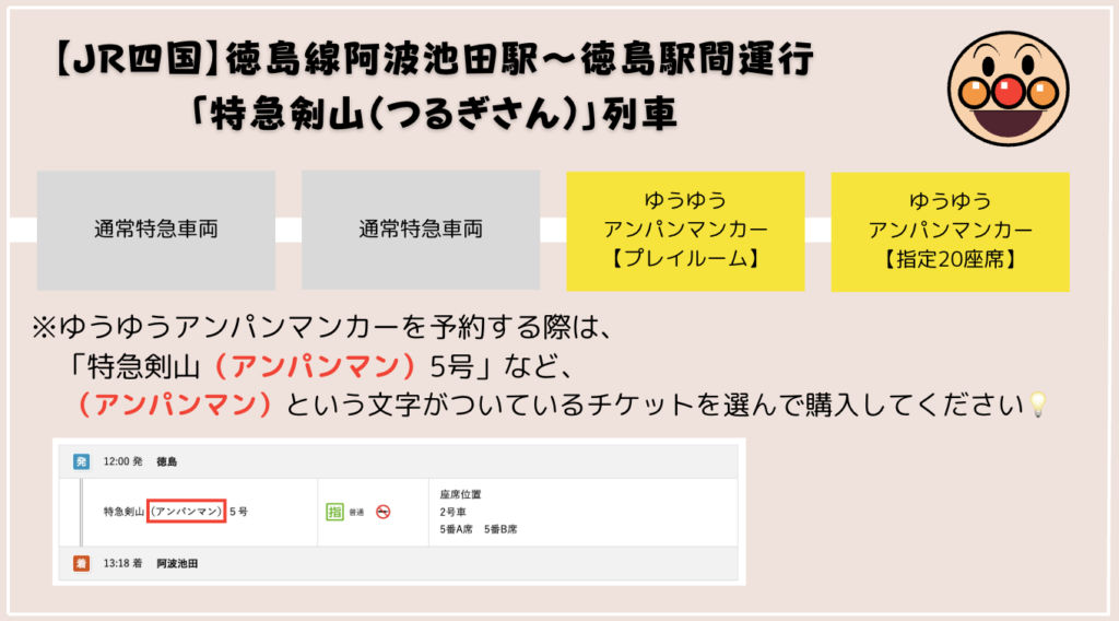 e5489でオンライン予約、またはみどりの窓口でできます。同じ時間にゆうゆうアンパンマンカーの列車とくっつけて普通特急列車も走っているので、必ず「(アンパンマン)」と文字があるチケットを予約するように注意してください。